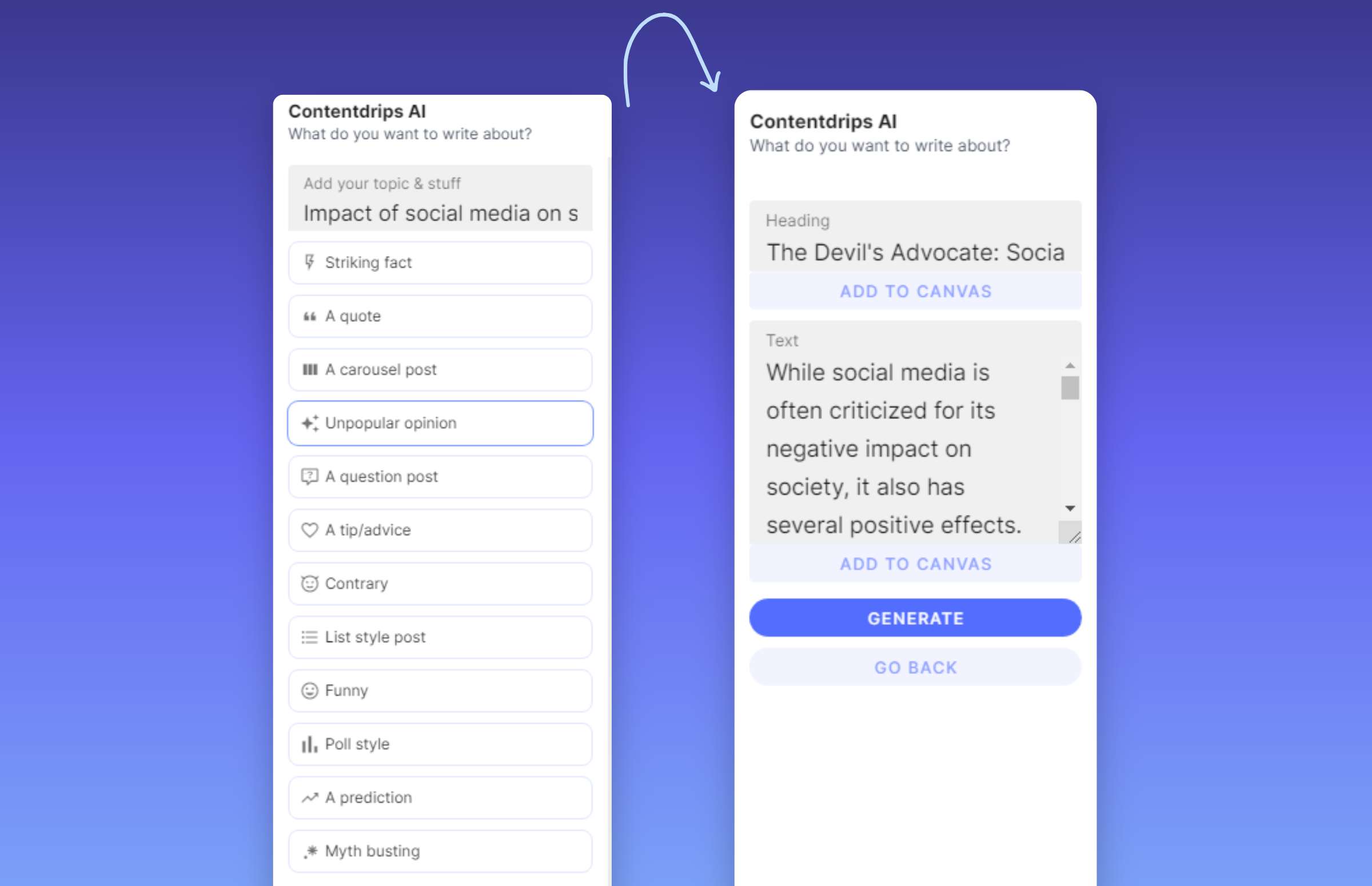 Contrary opinions have the potential to spark lively debates, encourage critical thinking, and broaden perspectives. With Contentdrips’ Contrary feature, you can inspire your audience to question assumptions and consider alternative viewpoints.