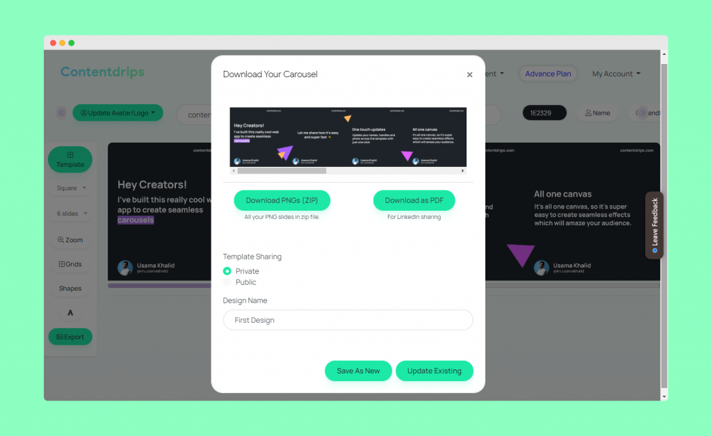 - After you have finished your carousel design, you can download it via the “Export” button. There you can choose if you want to download your carousel in PNG (ZIP) or in PDF. Also, you can safe your template if you want to keep on working on it or use it again another time.