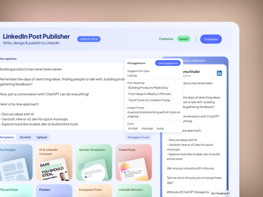 - Write, design, and schedule posts directly to LinkedIn.