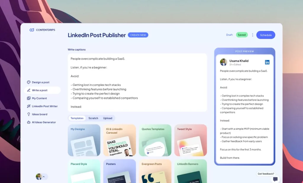 Contentdrips is an all-in-one social media design tool that has everything you need to shine on Linkedin — from writing and designing to scheduling and publishing. And unlike Taplio, we keep your account safe by not requesting cookies or violating LinkedIn’s policies. We’re also a budget-friendly alternative to Taplio, offering all these and more for just $15/month.