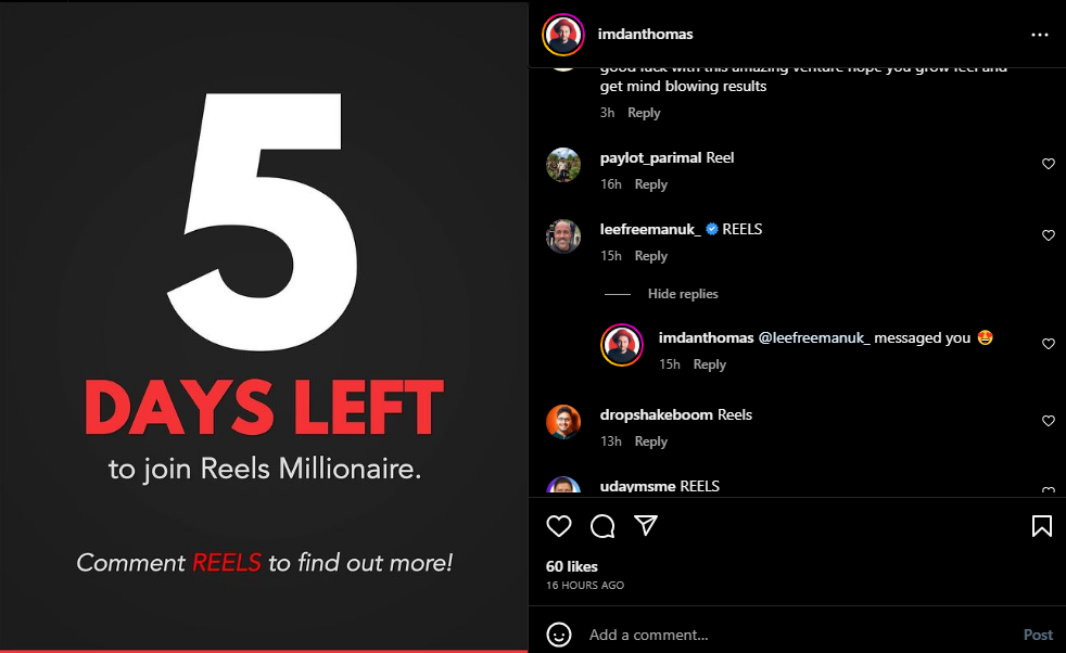 Another thing that’s been going around is content creators talk about or describe a resource, hide the real valuable piece of information and ask their audience to comment on their post to receive it in private message.