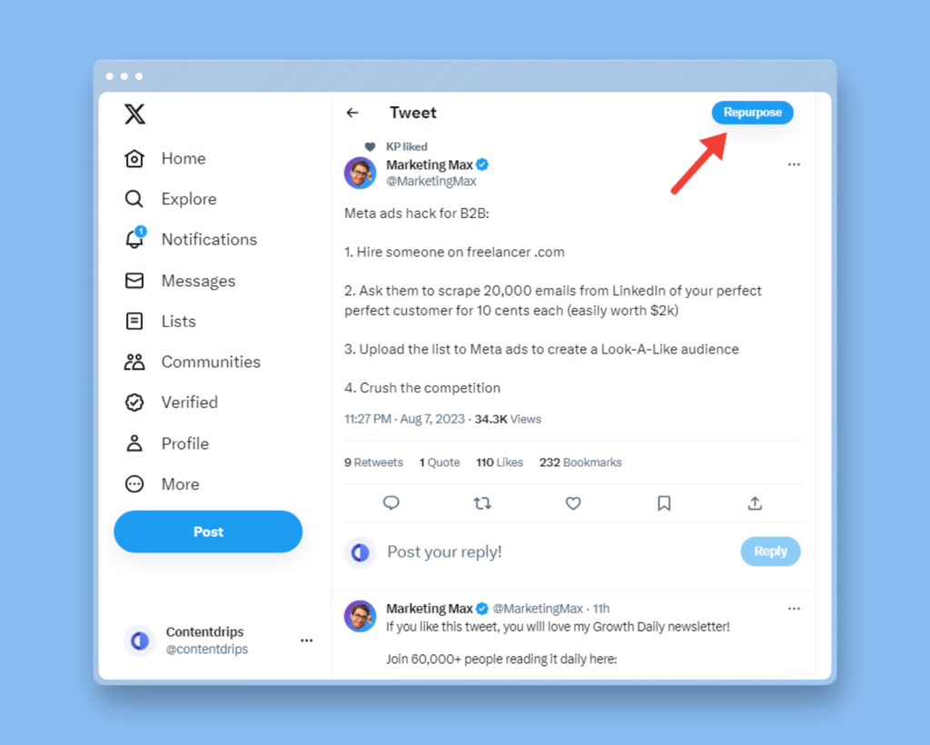 Go to your twitter and open the tweet or Twitter thread you want to repurpose, and you’ll see the repurpose button next to your tweet.