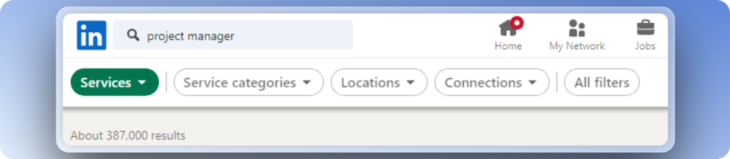 Simply search for the service that you’re looking for and select ‘Services’ from the filter bar and you’ll see all the people who are providing that service through LinkedIn.