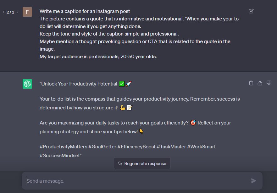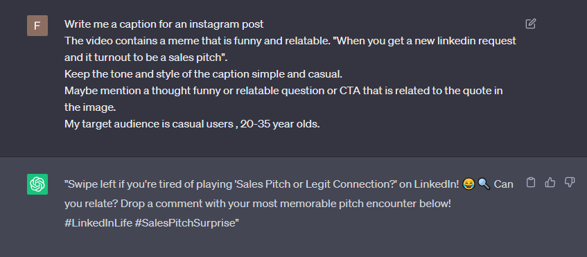 After you’ve used the prompt given above for generating a caption for post, you can then simply ask ChatGPT: