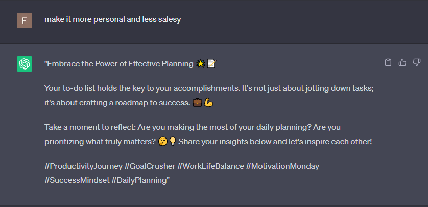 You can further enhance your post by asking ChatGPT to make changes to its tone or make it shorter or longer.