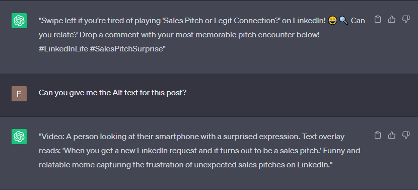 Additionally, you can utilize ChatGPT to generate alt text, which provides a textual description of your visual content for those who cannot see it.