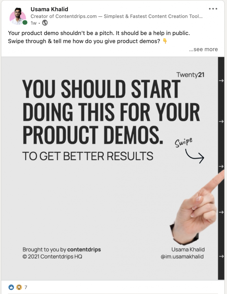 Thus, we highly recommend that you turn most of you text content, be it a blog post or a twitter thread into carousel posts since they perform better.