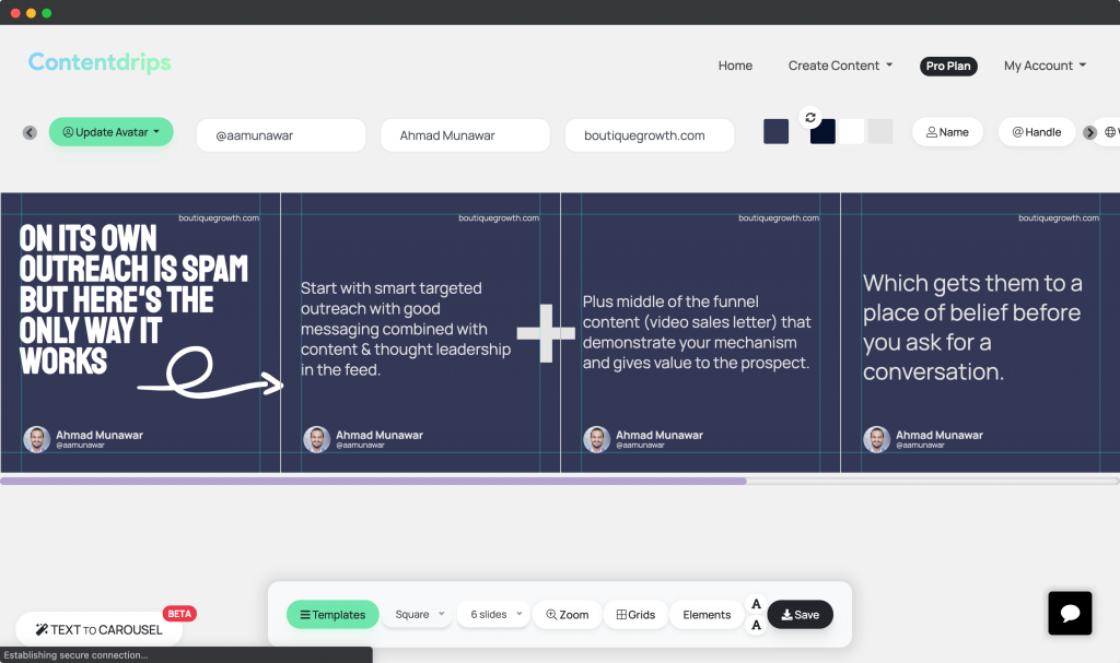 To create carousels for your LinkedIn, you can make use of Contentdrips Carousel Maker. This is an easy to use web application which works on any browser, and allows you to generate seamless carousels for your LinkedIn.