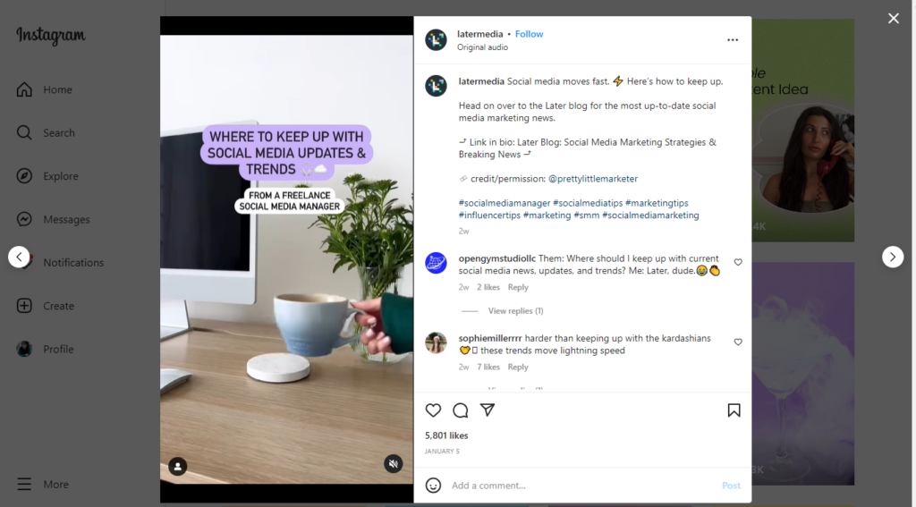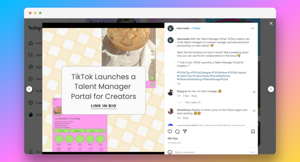 Post your blog content as short engaging video reels on Instagram or Tiktok. Your reels could even land on the explore page which will help other users discover your content and generate more traffic toward your page.