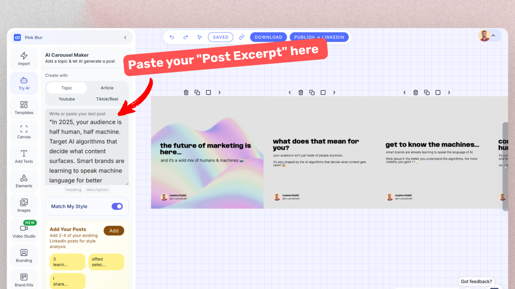 Now take those ideas and make them into actual posts like a well written text post and then a social media carousel for LinkedIn & Instagram.