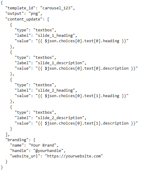 - Design a post or carousel template in the ContentDrips editor, note the Template ID (e.g., carousel_123 from https://app.contentdrips.com/canvas?template=carousel_123), and label textboxes.